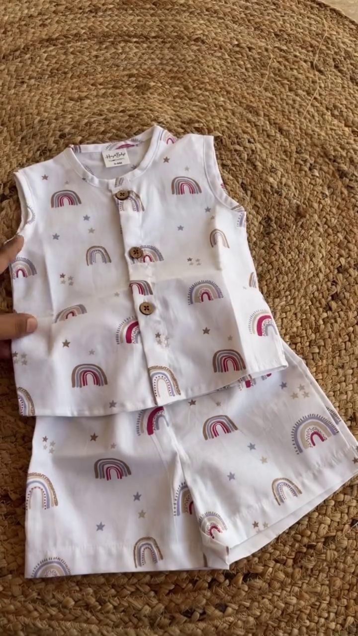 Make everyday dressing joyful with this adorable rainbow print jabla set designed especially for your little bundle of joy. This two-piece baby outfit includes a sleeveless top and comfy matching shorts, all crafted from ultra-soft, breathable cotton to keep your baby cool and happy all day long.