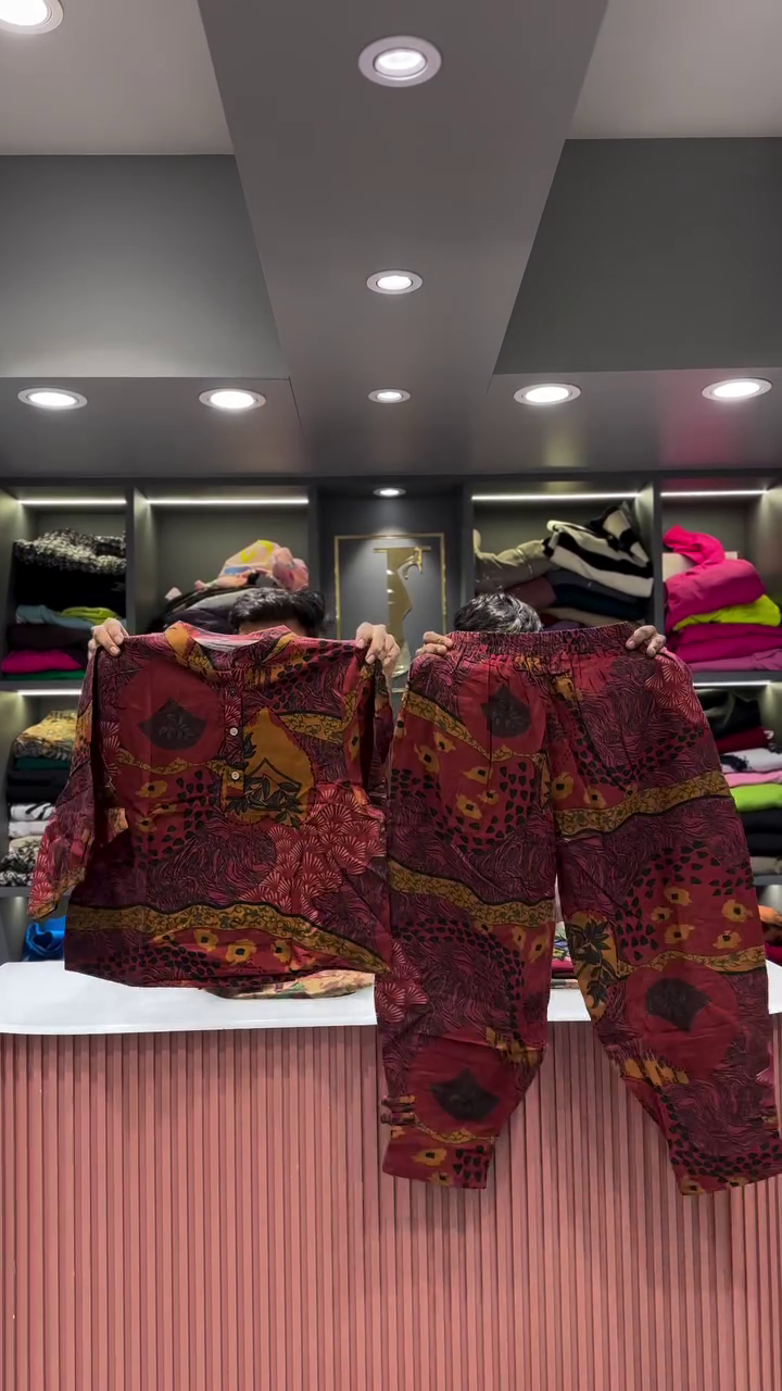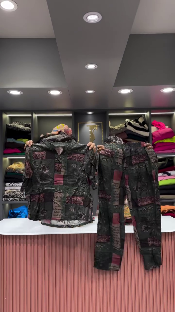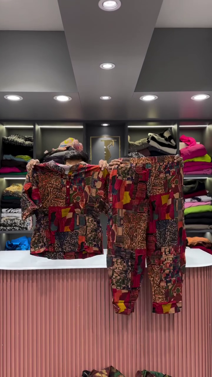 The two pieces are held up for display by two people, one on each side, which is a common presentation style in an e-commerce setting. This allows a potential customer to see both pieces of the set and how they complement each other. The backdrop is a clean and professional retail space. A light pink, vertically fluted counter is visible in the foreground, and behind the counter, there are shelves neatly arranged with folded clothing in a variety of colors. The bright, even lighting ensures that the vibrant colors and intricate details of the patchwork print are shown in their best light. This two-piece set is a fantastic choice for anyone who wants to make a bold fashion statement. It combines the comfort of a casual outfit with the visual impact of an artistic piece, making it a versatile and stylish addition to any wardrobe.