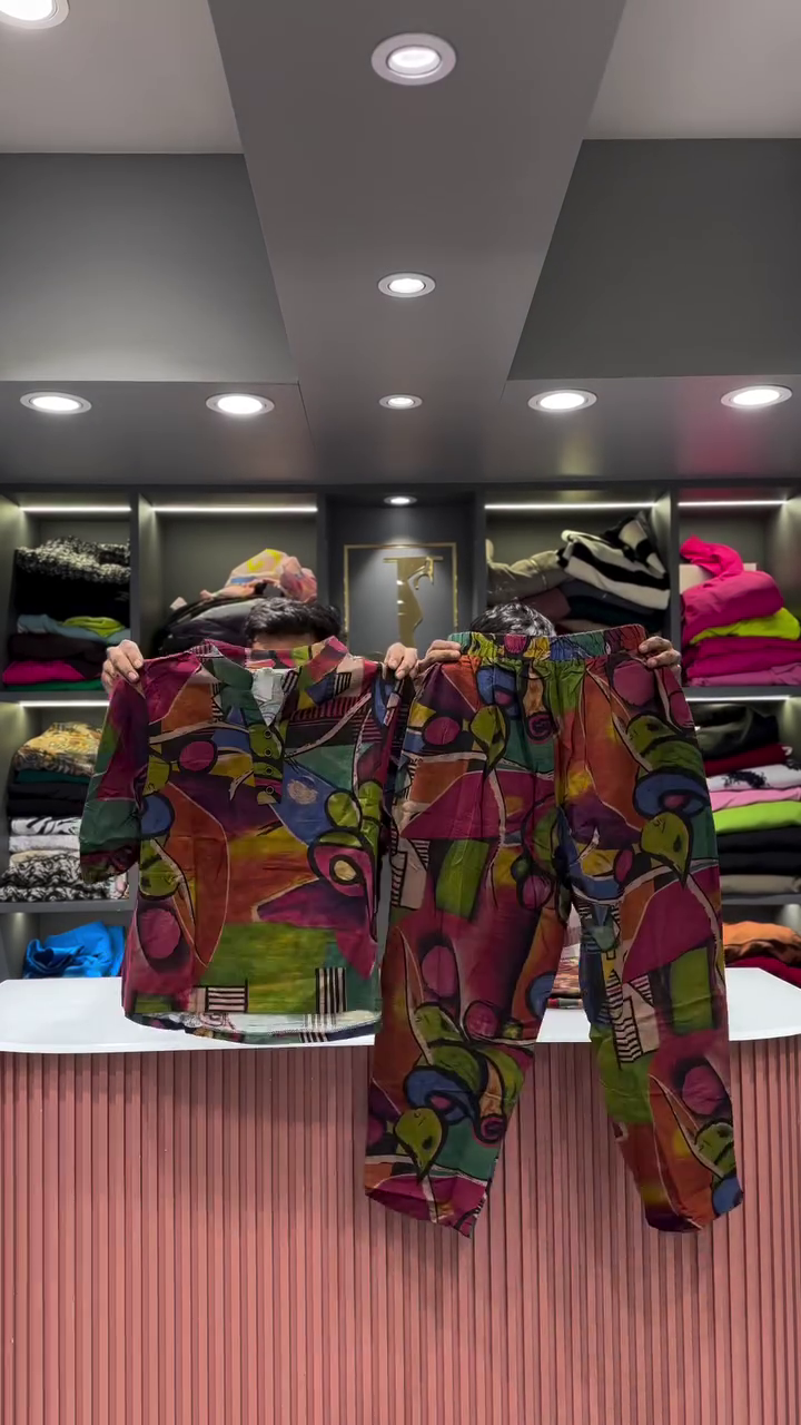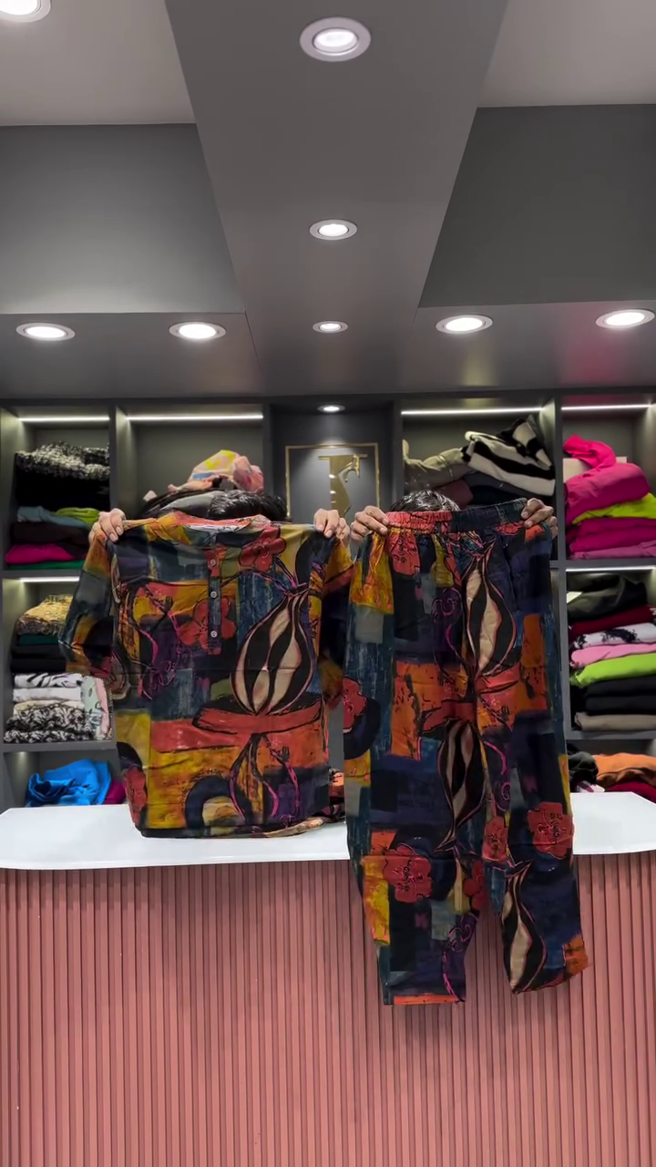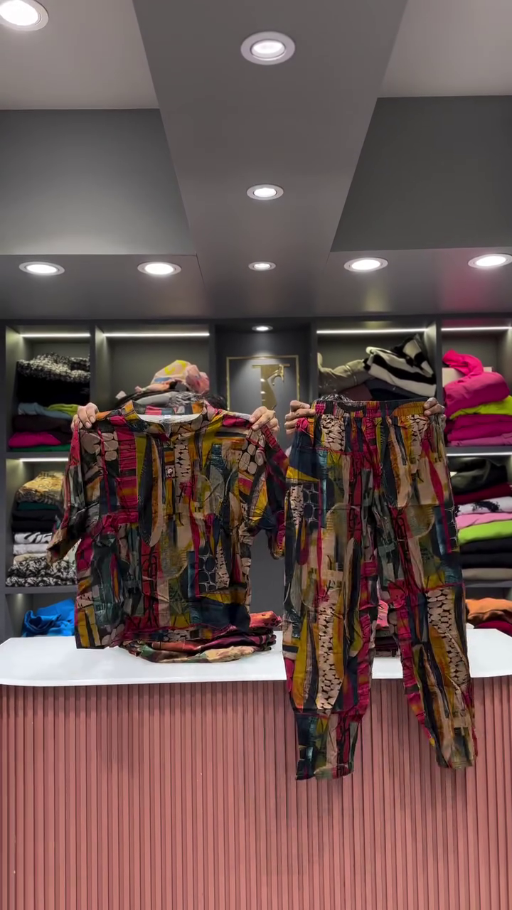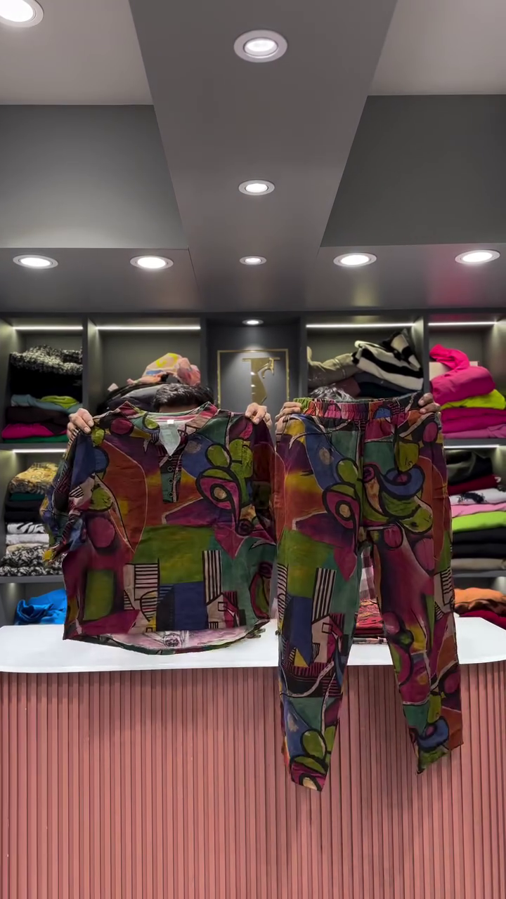 This image showcases a vibrant and eye-catching two-piece outfit, presented for a clear view by two individuals against a modern retail backdrop. The ensemble is a celebration of color and pattern, featuring an intricate abstract patchwork print that covers both the top and the pants. This design gives the outfit a unique, artistic, and bohemian feel, setting it apart as a true statement piece.