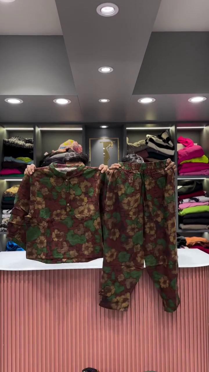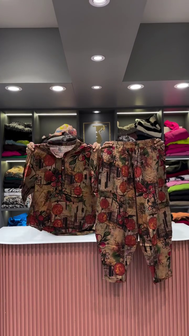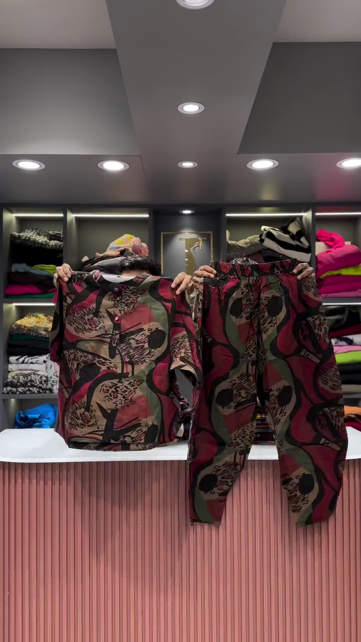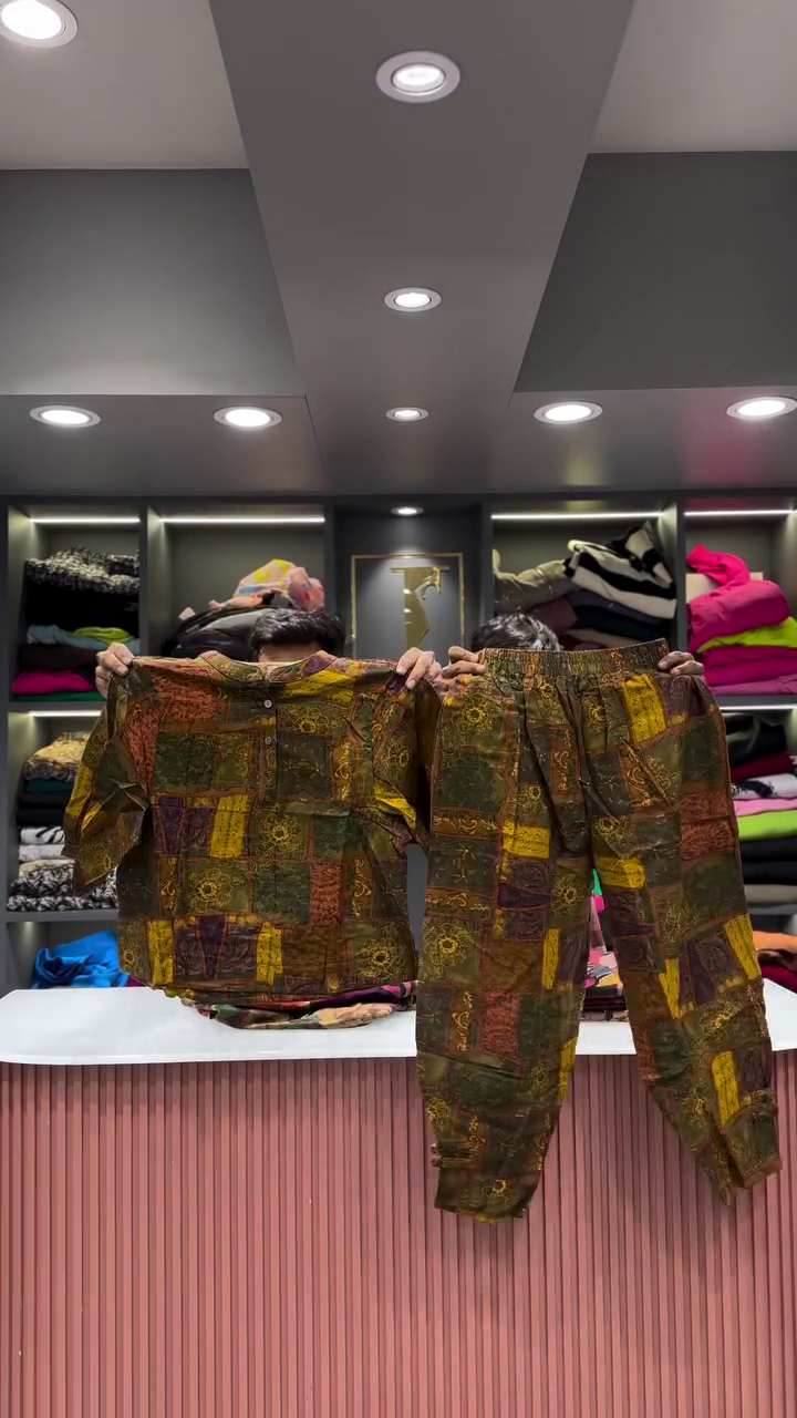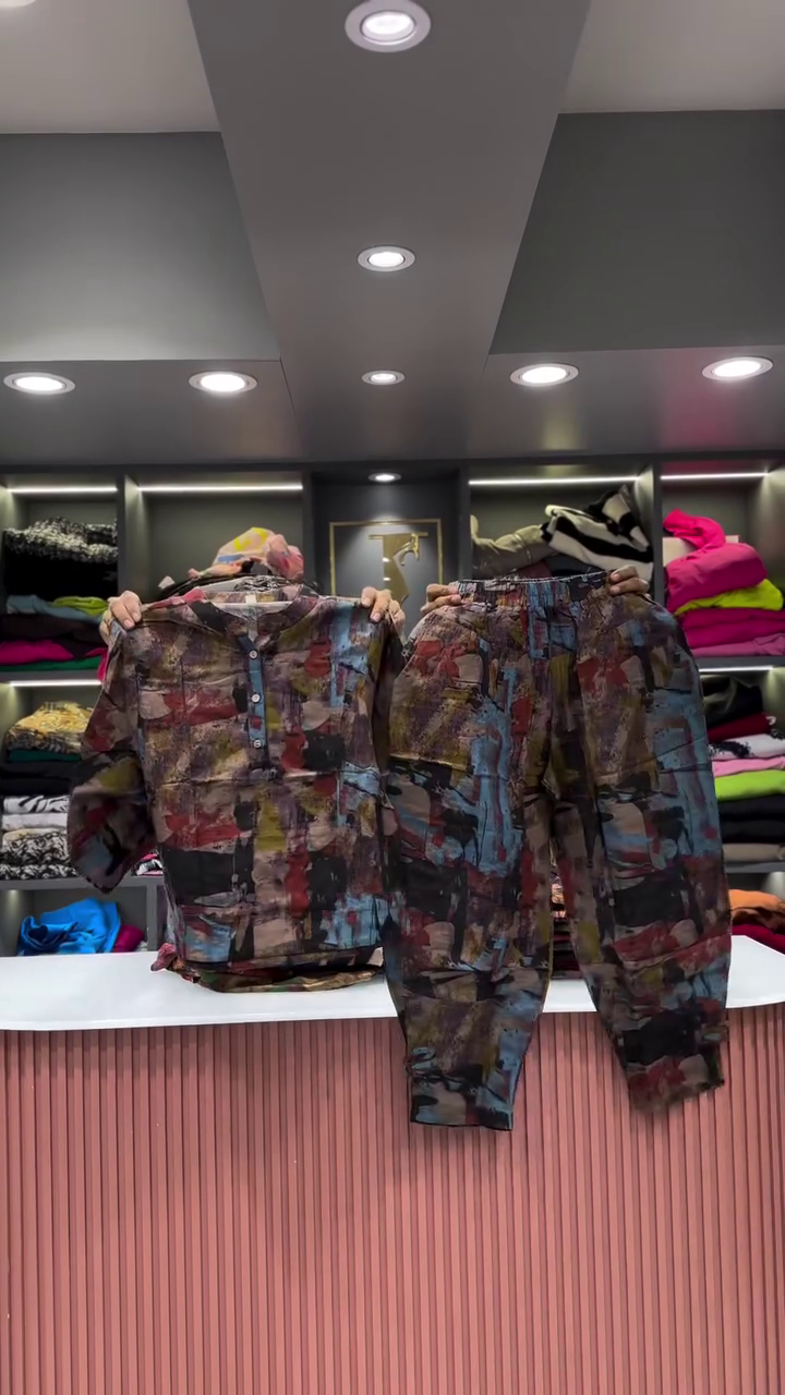 This image showcases a vibrant and eye-catching two-piece outfit, presented for a clear view by two individuals against a modern retail backdrop. The ensemble is a celebration of color and pattern, featuring an intricate abstract patchwork print that covers both the top and the pants. This design gives the outfit a unique, artistic, and bohemian feel, setting it apart as a true statement piece.