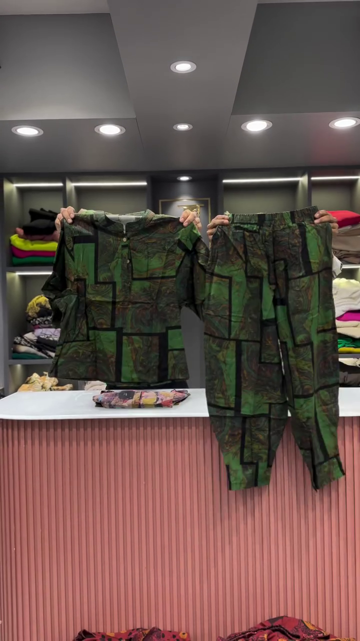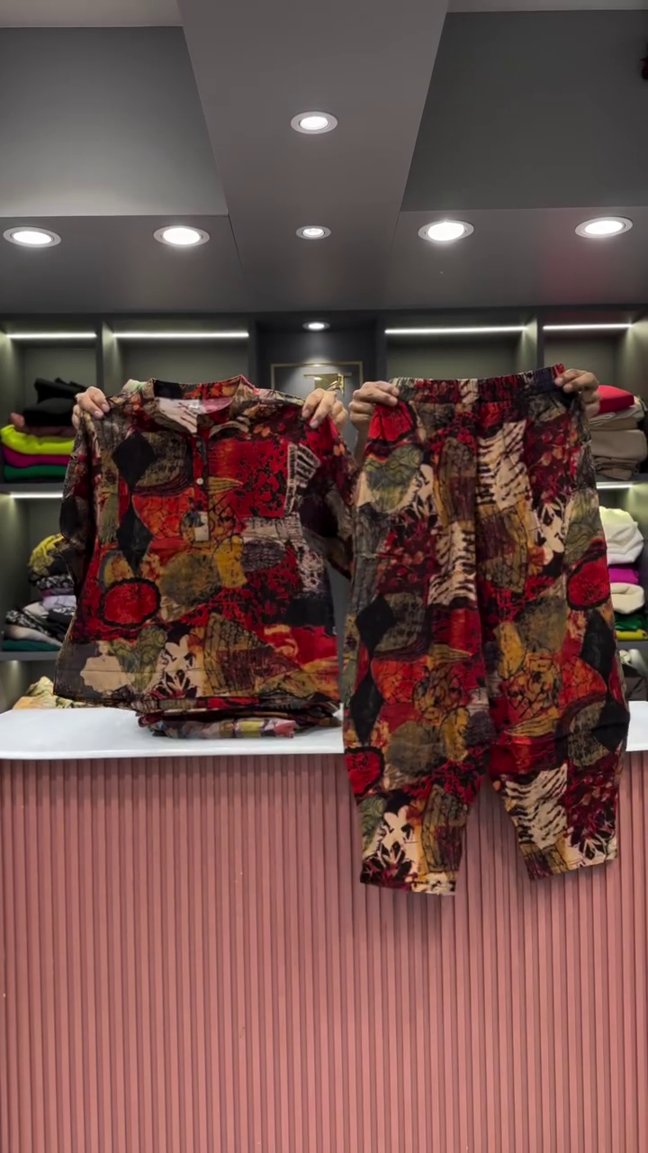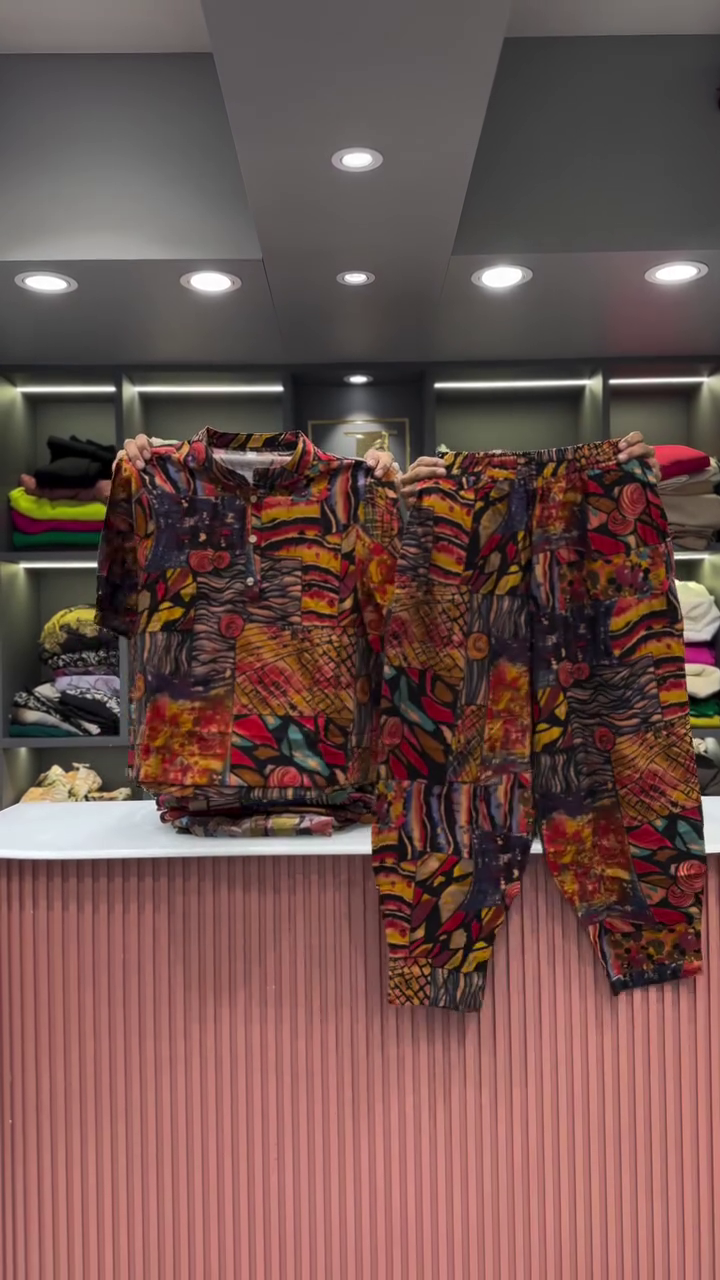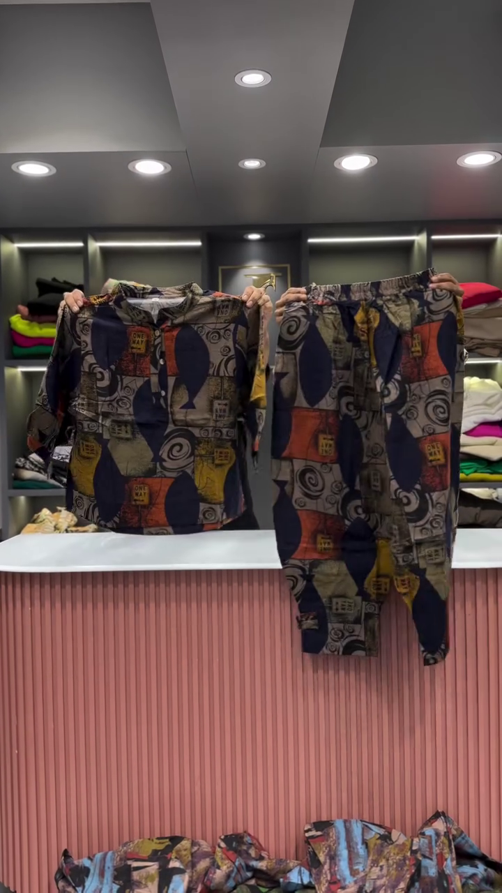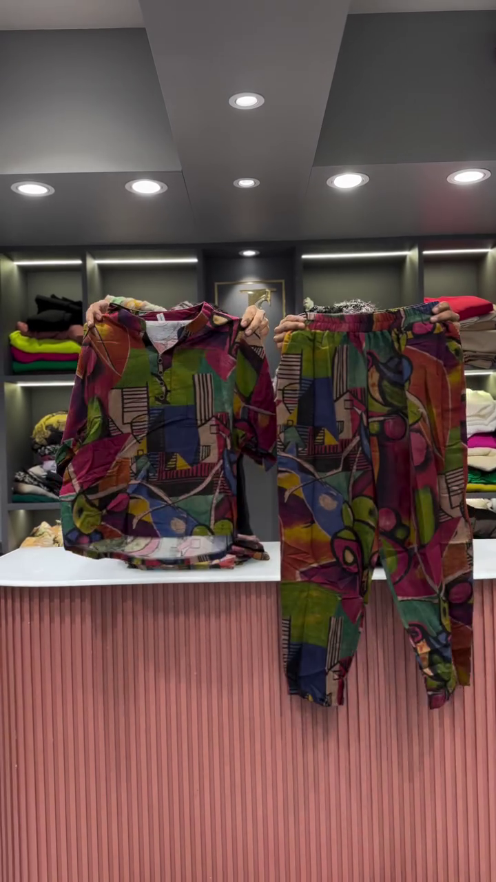 The two garments are presented side-by-side, showcasing their combined effect. The backdrop is a clean and professional retail space. A light-colored, vertically fluted counter is visible in the foreground, providing a clean surface for the presentation. In the background, there are shelves neatly arranged with folded clothing in a variety of colors, which helps to place the outfit within a larger fashion context. The bright, even lighting ensures that the vibrant colors and intricate details of the abstract print are clearly visible, and that the quality of the fabric is well-represented. This two-piece set is an excellent example of an outfit that is both effortless to wear and makes a powerful style statement. Its unique print and comfortable fit make it a versatile addition to any wardrobe, perfect for a casual day out or for someone who wants to express a bold and artistic sense of style.