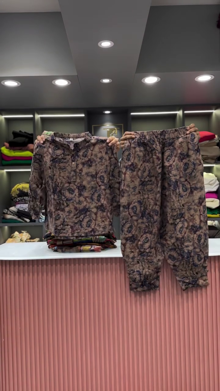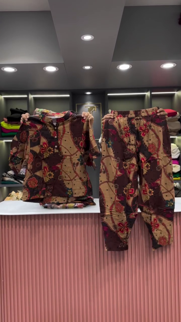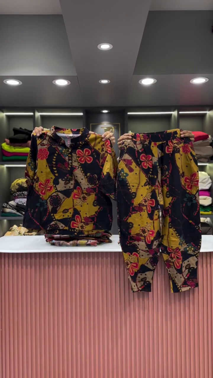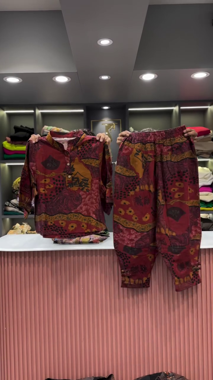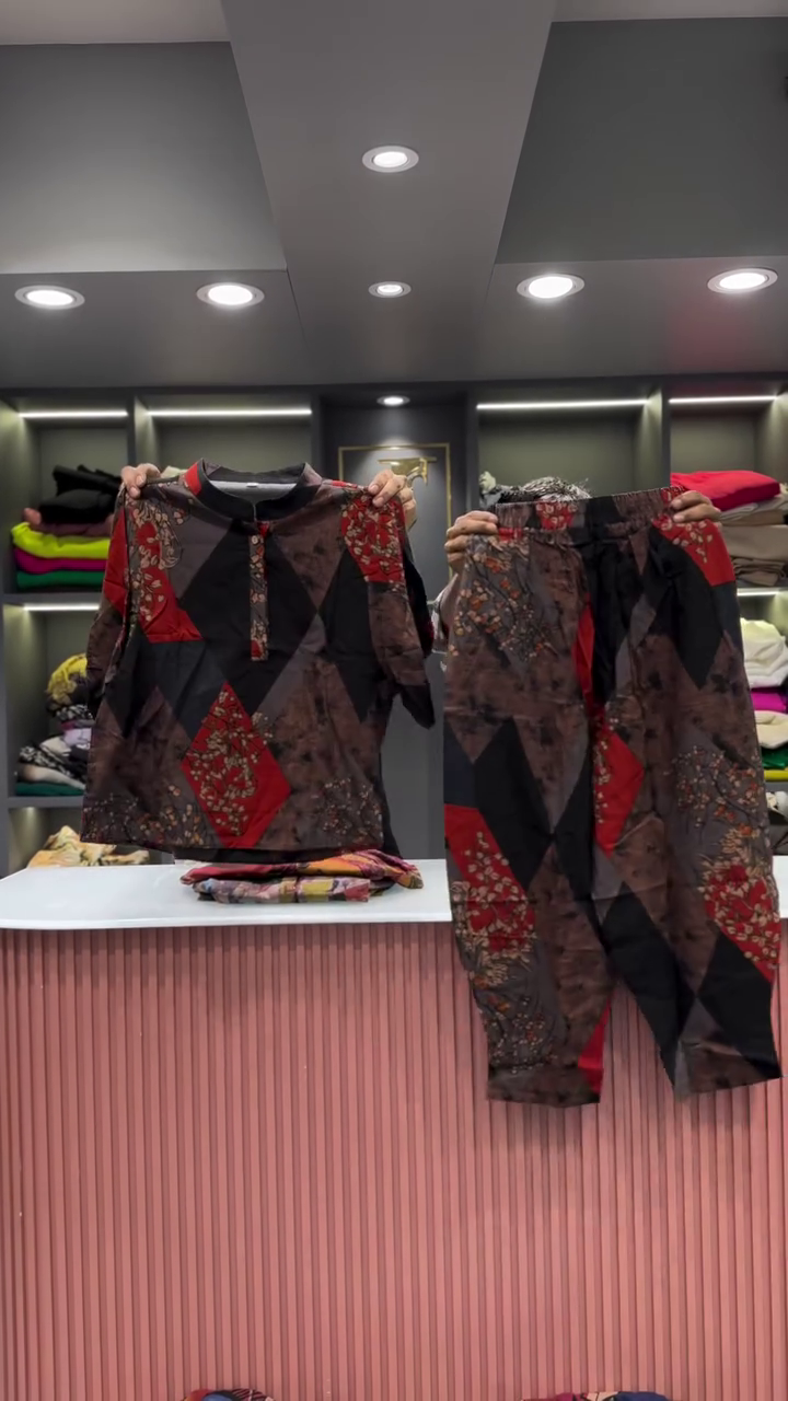 The two garments are presented side-by-side, showcasing their combined effect. The backdrop is a clean and professional retail space. A light-colored, vertically fluted counter is visible in the foreground, providing a clean surface for the presentation. In the background, there are shelves neatly arranged with folded clothing in a variety of colors, which helps to place the outfit within a larger fashion context. The bright, even lighting ensures that the vibrant colors and intricate details of the abstract print are clearly visible, and that the quality of the fabric is well-represented. This two-piece set is an excellent example of an outfit that is both effortless to wear and makes a powerful style statement. Its unique print and comfortable fit make it a versatile addition to any wardrobe, perfect for a casual day out or for someone who wants to express a bold and artistic sense of style.