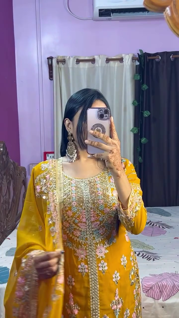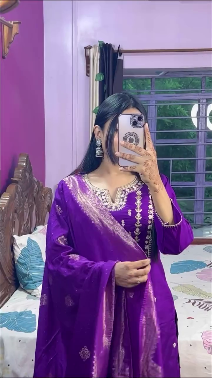 This outfit is a perfect example of timeless ethnic fashion. The georgette fabric is breathable and lightweight, making it comfortable for long hours of wear. The heavy thread-work is executed with precision, ensuring a high-quality finish and durability. Style this set with cream or gold-toned jewelry and high heels to accentuate the elegant color combination. The embroidery is designed to be multi-dimensional, with different stitch thicknesses used to create depth and texture across the floral designs.
