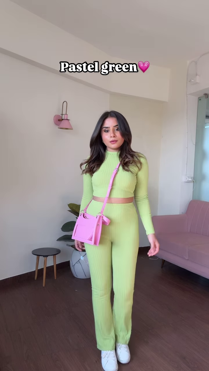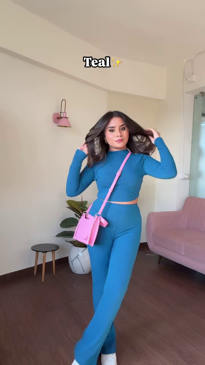 This chic teal ribbed knit co-ord set with its cropped turtleneck top and wide-leg pants is a fashionable and comfortable choice for various occasions. The vibrant teal color makes a statement, while the ribbed knit adds texture and coziness. The addition of the bright pink crossbody bag introduces a playful and trendy contrast, making this ensemble a stylish and eye-catching look.