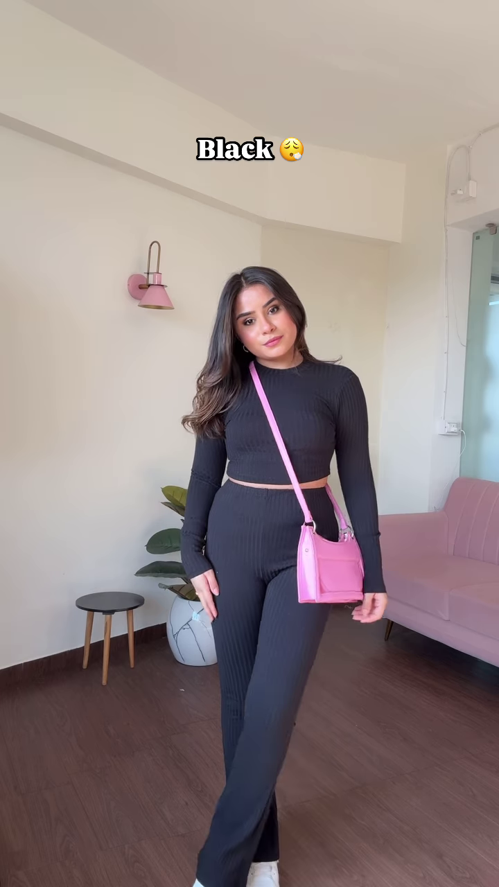 The matching pants are high-waisted with a wide-leg silhouette. The ribbed knit fabric flows beautifully, offering both comfort and a trendy look. The high waistband accentuates the waistline and contributes to the overall flattering fit of the set. The wide legs provide ease of movement and a relaxed yet chic appearance.