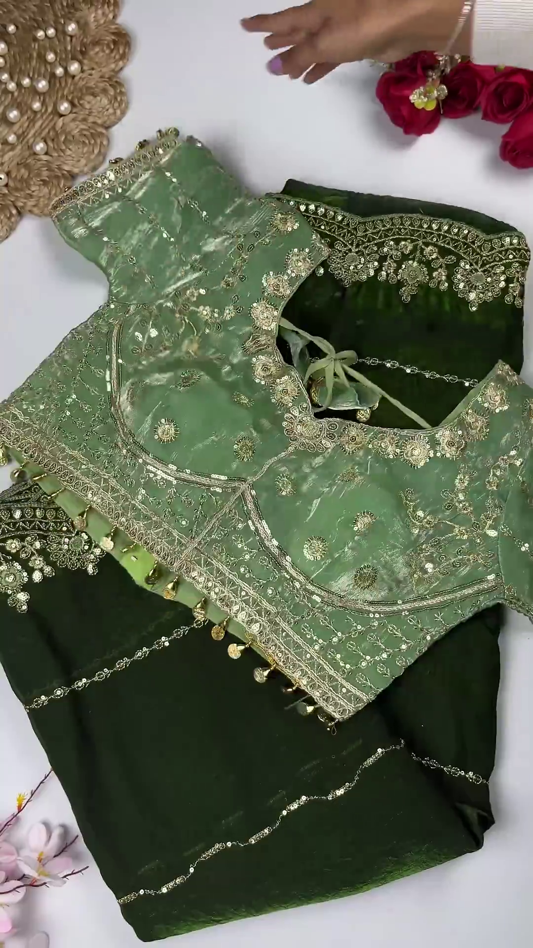 One of the standout elements of this blouse is the elegant golden coin (latkan-style) border adorning the hemline. These delicate dangling coins add movement, charm, and a festive touch, making the blouse look exceptionally rich when worn with sarees or lehengas. The neckline is softly rounded and highlighted with fine embroidery, ensuring comfort without compromising on luxury.