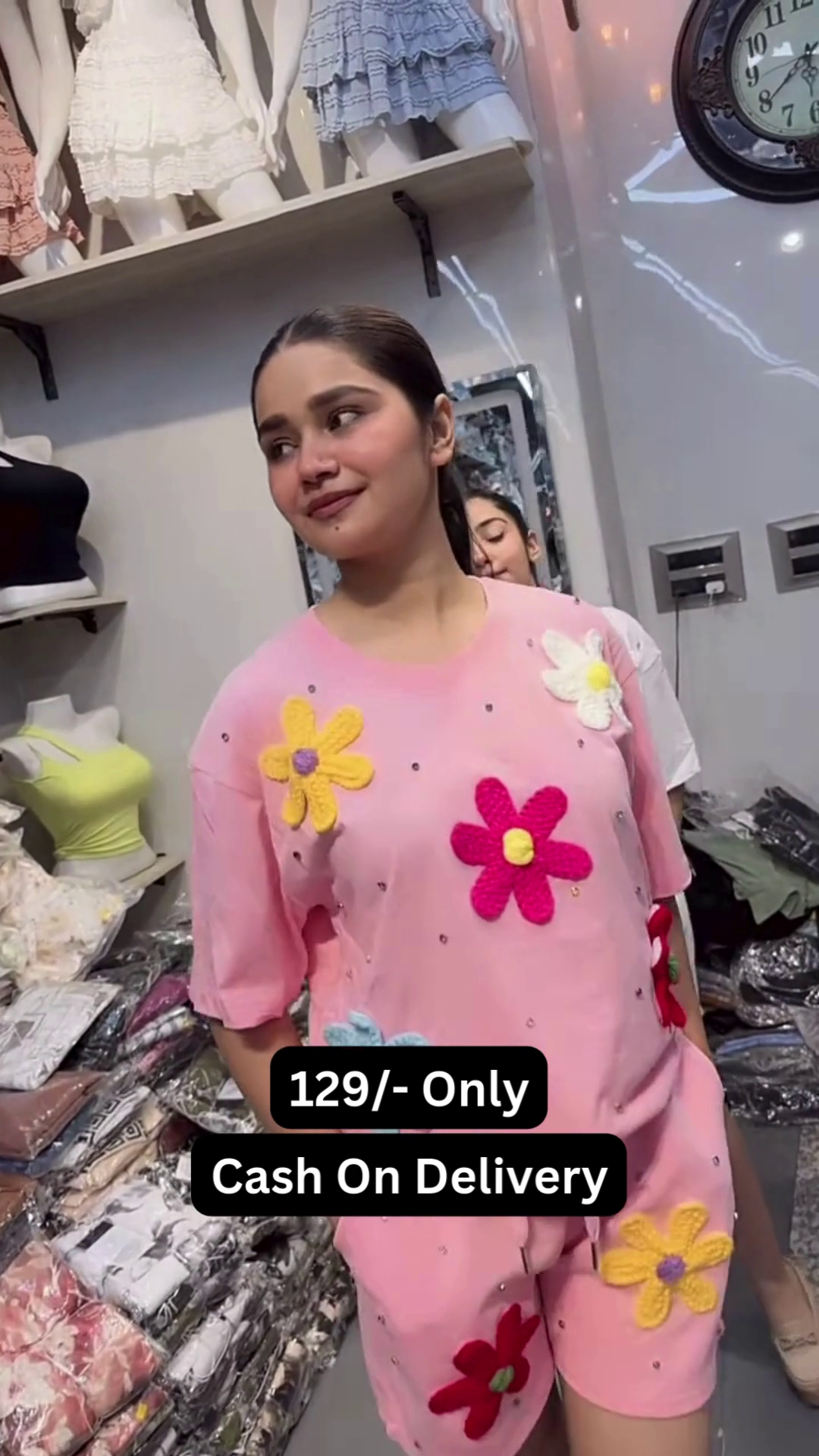 The matching shorts are designed with a comfortable elasticized waistband, ensuring a snug yet gentle fit. The length of the shorts is ideal for warm weather, allowing for ease of movement and breathability during sleep in your Ahmedabad home. Similar to the top, the shorts also feature the same cute floral appliqués, creating a coordinated and charming pajama set. The placement of the flowers on the shorts complements the design of the top, resulting in a cohesive and adorable sleepwear ensemble.