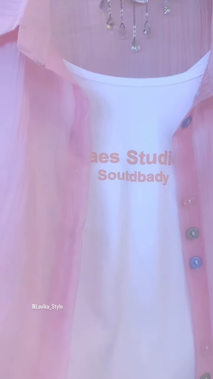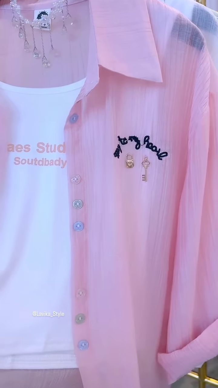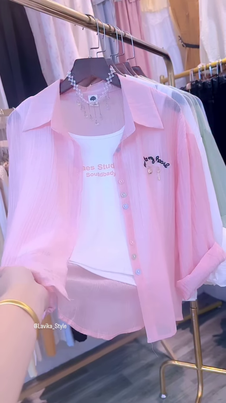 This two-piece set is designed for effortless style and is a fantastic addition to any wardrobe. The pieces can be worn together for a coordinated and polished look, or they can be mixed and matched with other items. The pink sheer shirt can be layered over a dress, a tank, or a T-shirt for a versatile outerwear option. The white inner top is a perfect basic that can be paired with jeans, skirts, or trousers. Its ability to be styled in multiple ways makes it a true workhorse in your closet. This ensemble embodies a sense of easy, relaxed fashion, combining comfort with a chic, modern aesthetic.