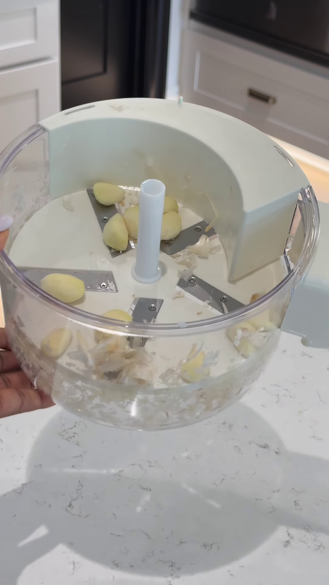 The design is sleek and modern, with a white and transparent finish that fits into any kitchen decor. The non-slip base ensures the unit stays stable during operation, and the high-quality plastic bowl is durable and resistant to odors. This tool is a must-have for anyone who loves cooking with fresh garlic and herbs but wants to skip the mess and smell of manual preparation. It’s an efficient, hygienic, and practical solution for one of the most common kitchen chores, allowing you to focus on the creative side of cooking.