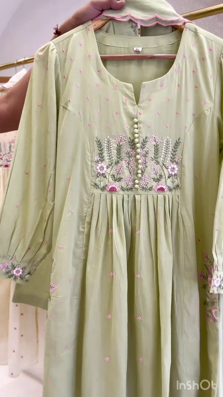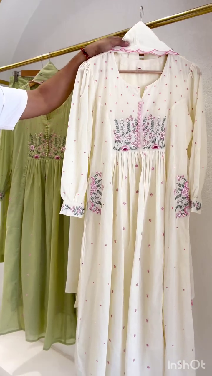 Elevate your wardrobe with this timeless embroidered cotton dress that beautifully blends grace with comfort. Designed in a flowing Anarkali silhouette, this outfit is perfect for both everyday elegance and festive charm. The dress comes in two serene colors – a delicate off-white and a soothing olive green – each adorned with fine floral embroidery that brings a refined, handcrafted touch to the garment.
