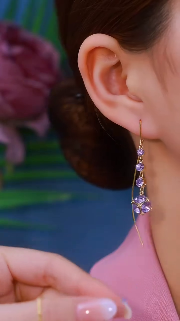 These elegant gold-toned dangling earrings with purple gemstone clusters are incredibly versatile and can be styled in numerous ways. They pair beautifully with both casual outfits, adding a touch of refined color, and more formal attire, enhancing its sophistication. Their understated glamour makes them suitable for a variety of occasions, from a daytime outing to an evening event. The subtle movement and the captivating sparkle of the purple gemstones are sure to draw attention and add a polished finish to any look.