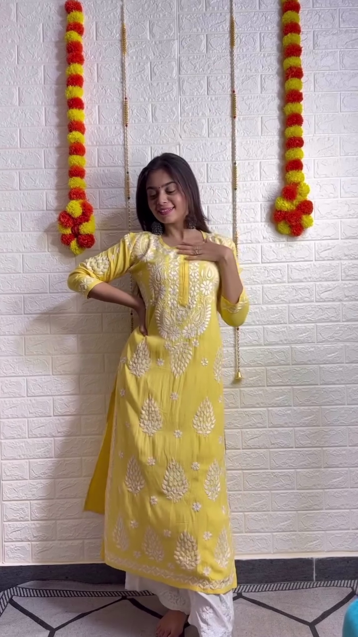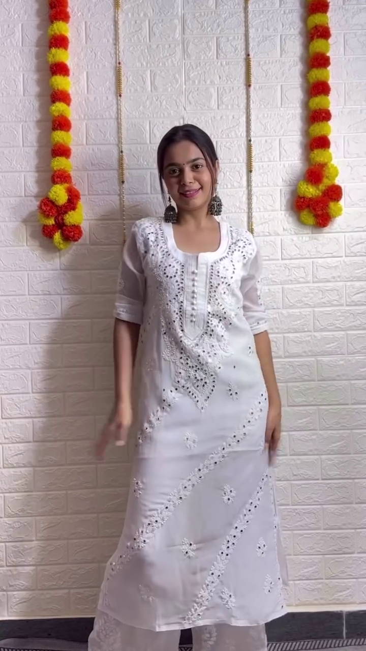 The set features a semi-sheer white kurta crafted in a lightweight fabric, enriched with intricate Chikankari embroidery throughout. The highlight is the sparkling mirror accents that elevate the look, especially around the neckline and bodice, catching light beautifully as you move. The kurta has a relaxed, straight-cut silhouette and a scoop neckline with button detailing, paired with equally elegant palazzo pants that mirror the embroidery patterns for a cohesive look.