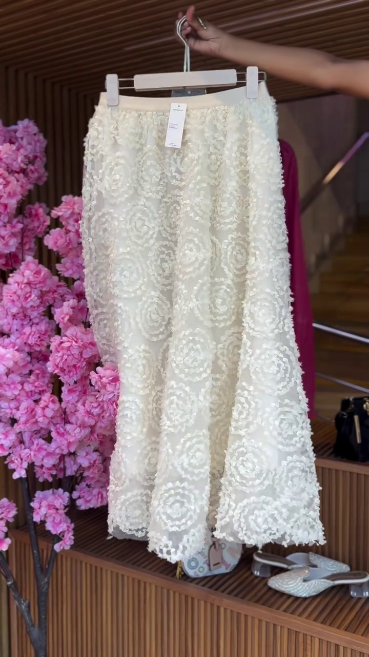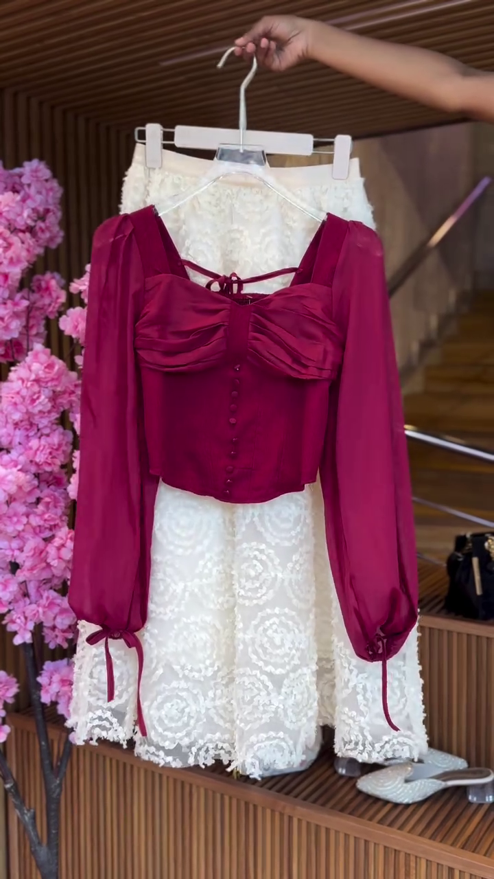This stylish Co-Ord Set features a beautifully embroidered organza top paired with a soft, flowy skirt.