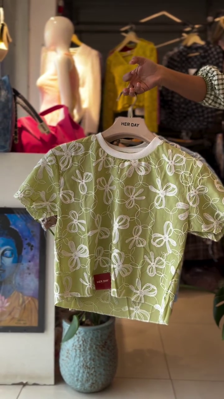 This elegant short-sleeved top features delicate white floral embroidery on a refreshing green base, offering a graceful blend of simplicity and charm. Designed for women who appreciate subtle detailing and breathable comfort, it’s perfect for daily wear, casual meetups, shopping days, and relaxed festive moments.