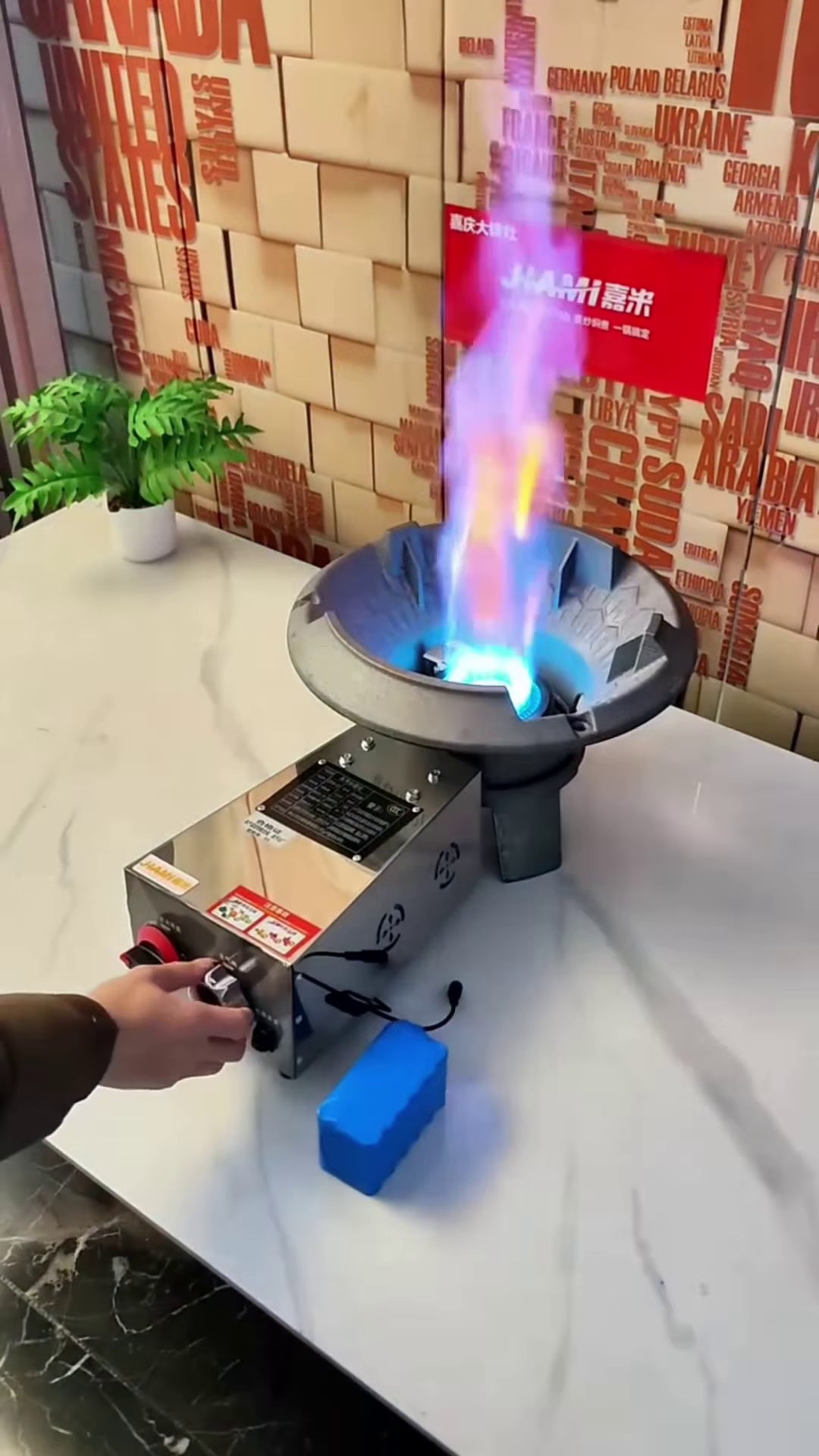 The engineering of this burner is focused on performance and reliability. It is equipped with a high-pressure gas valve that allows for precise control of the flame height, from a low simmer to a towering blue-and-purple flame as shown in the image. This level of heat is perfect for searing meats, flash-frying vegetables, and boiling large quantities of water in record time. The unit is connected to a durable stainless steel base that houses the control mechanisms and provides a stable platform for the burner. The base is designed with ventilation slots to ensure proper airflow and cooling of the components during extended use.
