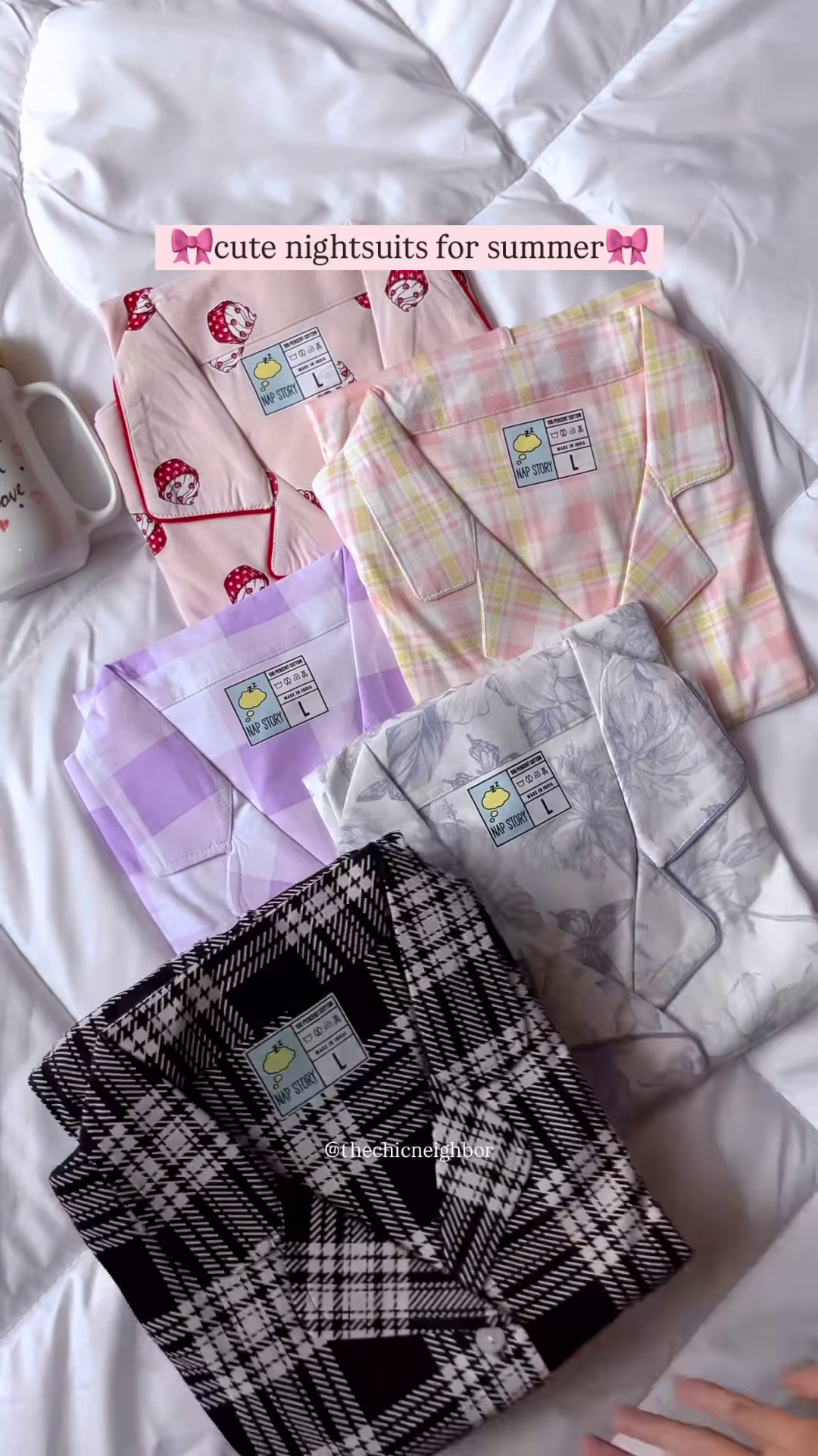 The individual in the image is holding a smartphone up to take a mirror selfie, partially obscuring their face. They have dark hair pulled back in a ponytail and are standing against a plain, light-colored wall. The focus is clearly on the pajama set and its design.