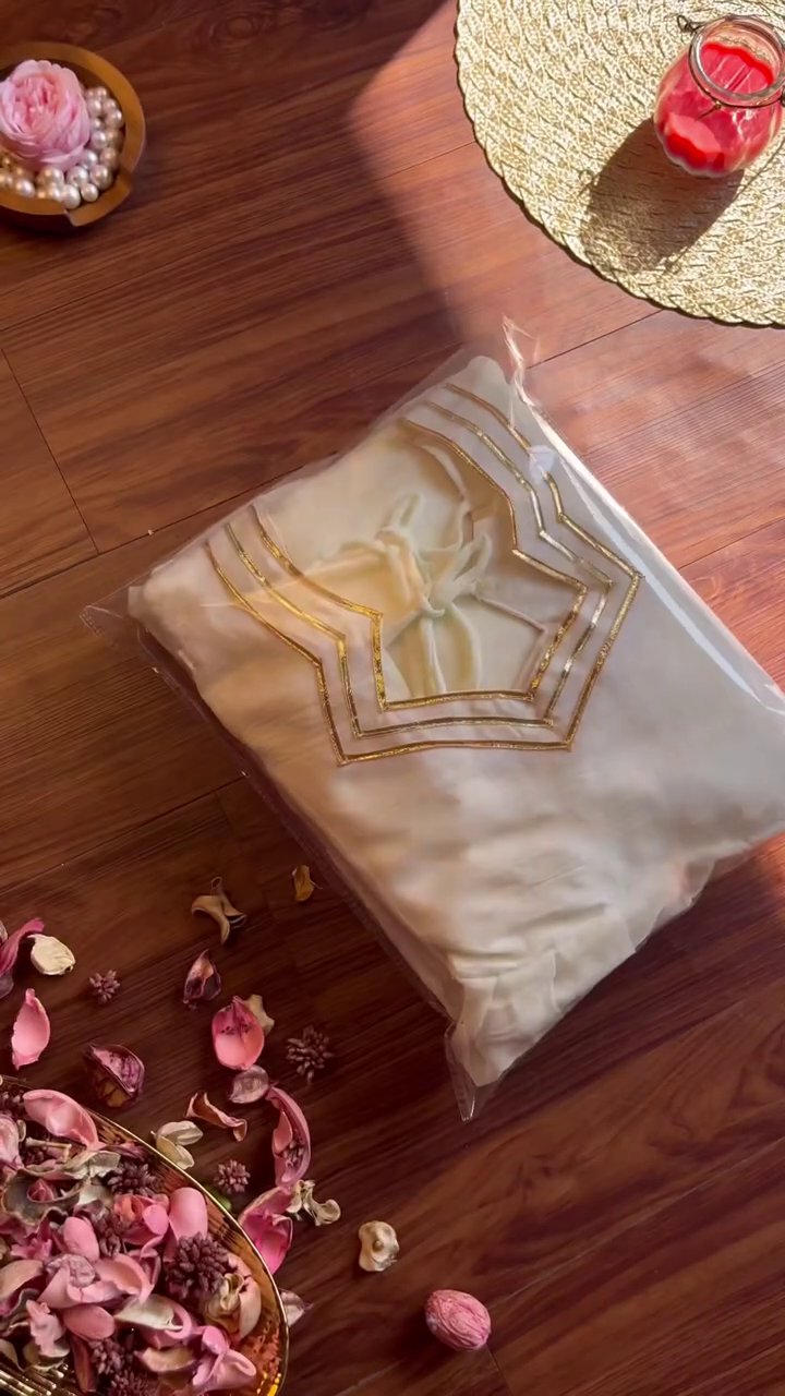 Dry Clean Only: Absolutely essential to maintain the cream color’s purity and protect the metallic gota work from tarnishing.