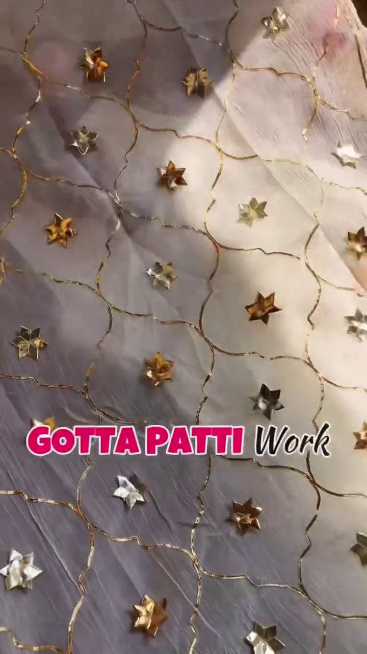 | Work Type | Multi-Layered Gota Patti Borders • Geometric Neckline |