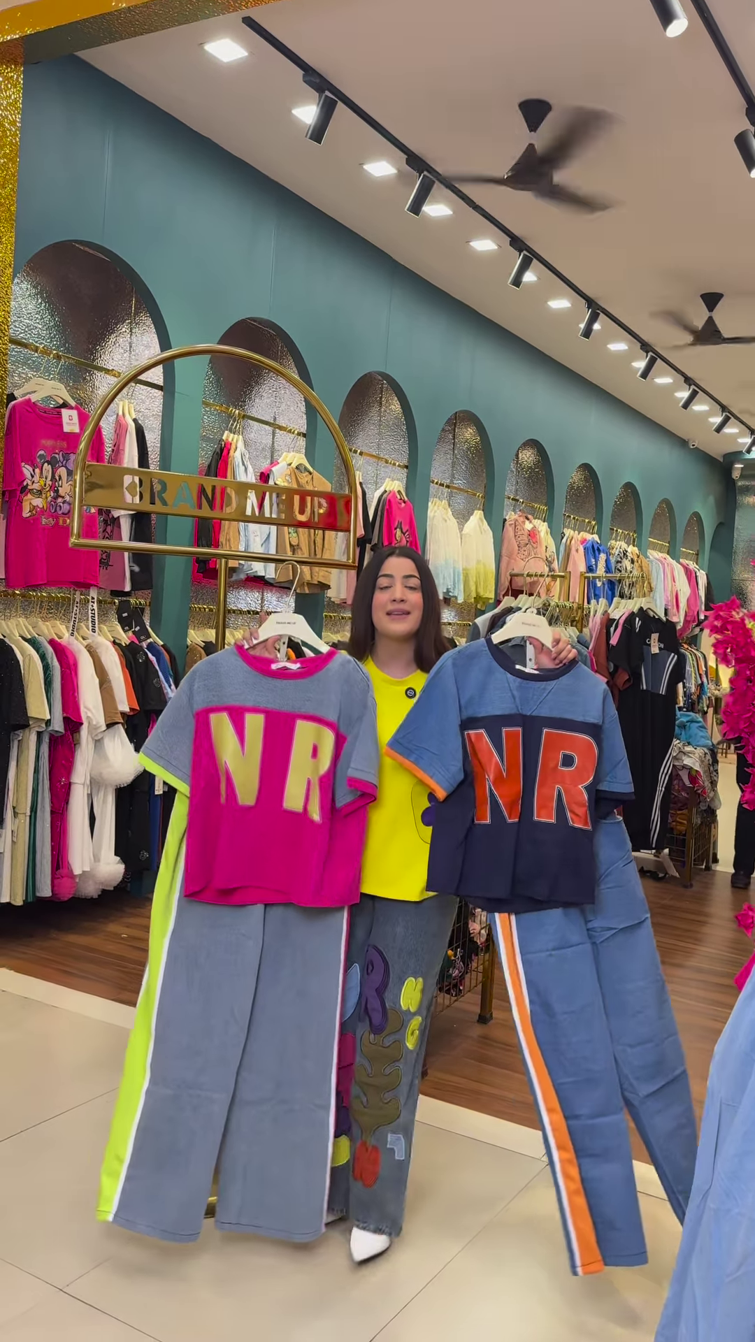 Set against a teal wall with gold accents, the retail environment adds boutique elegance and campaign depth. Track lighting and ceiling fans contribute to a well-lit, welcoming space that enhances garment visibility and shopper experience. The rack is topped with a sign that reads “BRAND ME UP,” suggesting a curated fashion series or thematic drop—ideal for WhatsApp broadcast promotions or influencer-led styling reels.