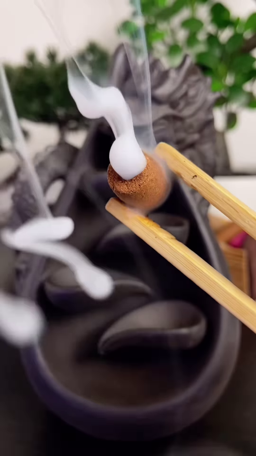 Positioned at the top of the dragon’s head is a lit backflow incense cone. As the incense burns, it releases a thick, white smoke that, due to its density, flows downwards in a mesmerizing waterfall-like effect. The burner is designed with a series of tiered, concave platforms or reservoirs beneath the dragon’s mouth. The smoke gracefully cascades from one level to the next, creating a serene and visually enchanting display reminiscent of a flowing waterfall or a mystical fog descending through the mountains.