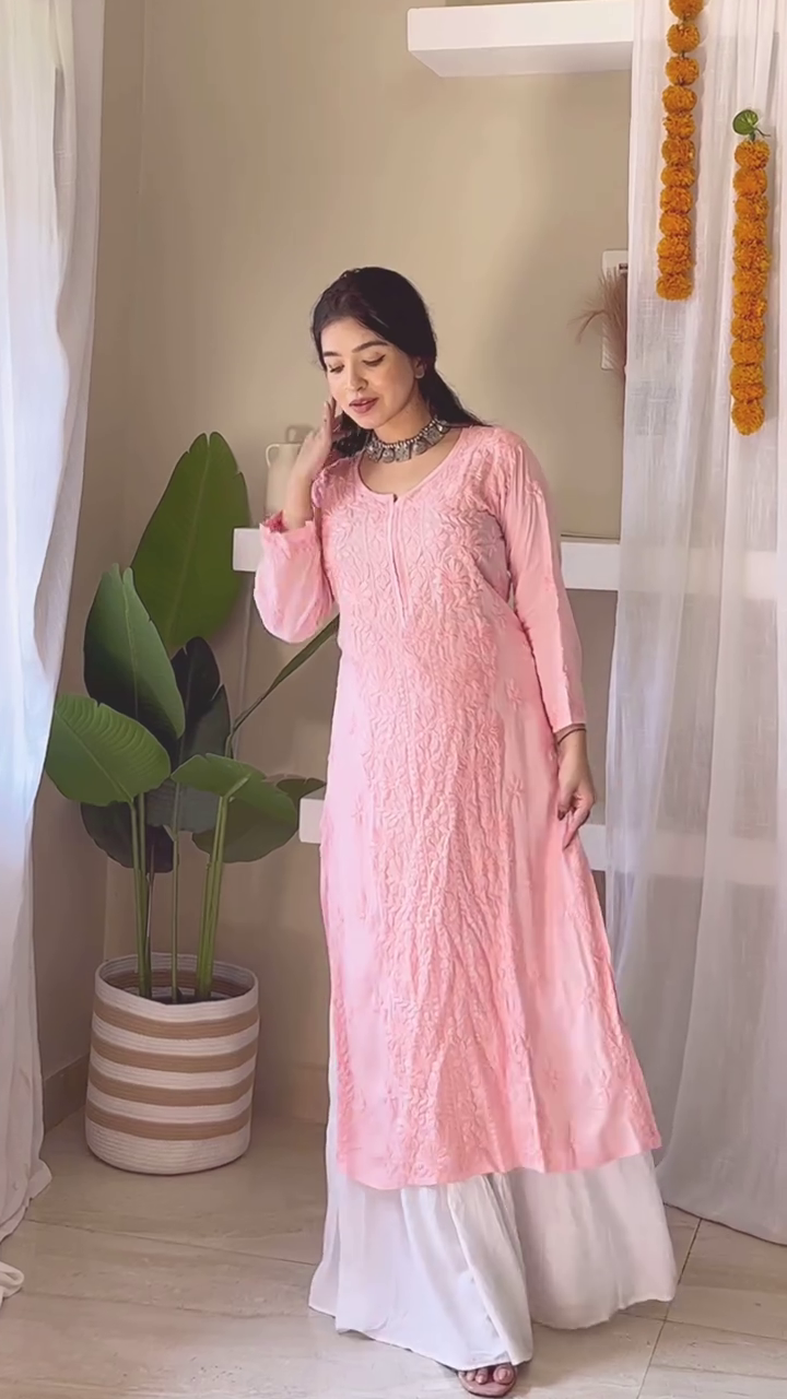 Made from lightweight cotton, the kurta features intricate self-colored Chikankari embroidery that adds delicate texture and an artisanal feel. The soft baby pink shade gives a feminine and calming appeal, making it a lovely option for spring and summer wardrobes. The long straight-cut kurta comes with full sleeves and a classic round neckline, striking the perfect balance between modesty and style.