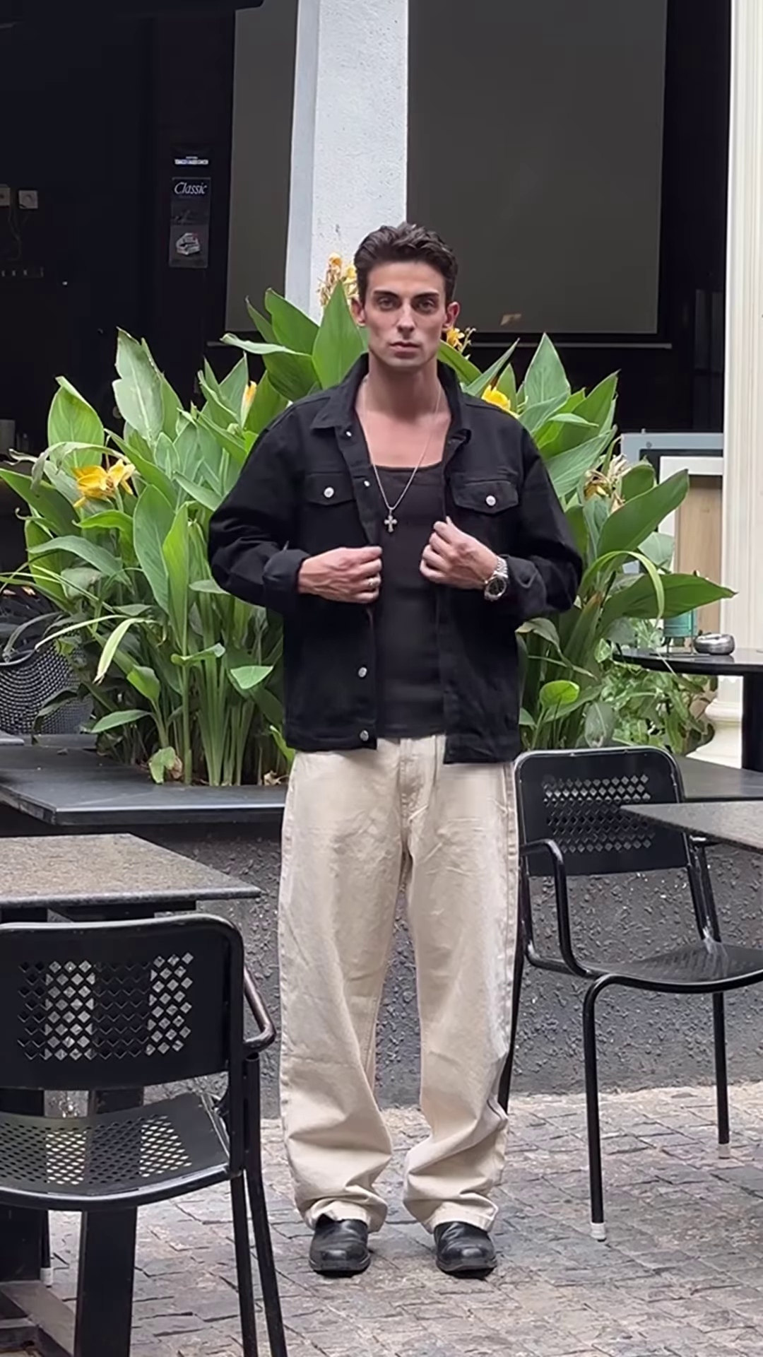 The overall impression is a well-coordinated and stylish outfit that blends casual elements with tailored pieces. The abstract print shirt adds a modern edge, while the pleated trousers provide a touch of classic elegance. The setting further enhances the stylish and relaxed aesthetic of the image.