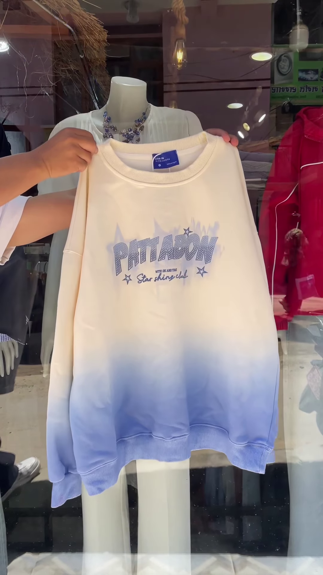 In terms of material and fit, the sweatshirt appears to be made from a classic, soft, and thick cotton blend, typical for a cozy and comfortable garment. The fit looks relaxed and slightly oversized, with a standard crewneck collar and a thick ribbed knit at the cuffs and hemline. This traditional silhouette ensures maximum comfort while the unique color and graphic make it a fashionable choice. The sweatshirt is being presented in what appears to be a store window or display area. The hands holding the garment are visible, and in the background, a mannequin can be seen wearing a simple white outfit, while a blurred reflection of the street or store interior is visible on the glass. The bright, focused lighting highlights the details of the sweatshirt, especially the texture of the print and the smooth color gradient. This item is an excellent example of a casual piece that doesn’t compromise on style. Its bold design and comfortable construction make it a versatile addition to any wardrobe, perfect for a cozy day at home or a casual outing with friends. It’s a piece designed to stand out and express a unique sense of style.