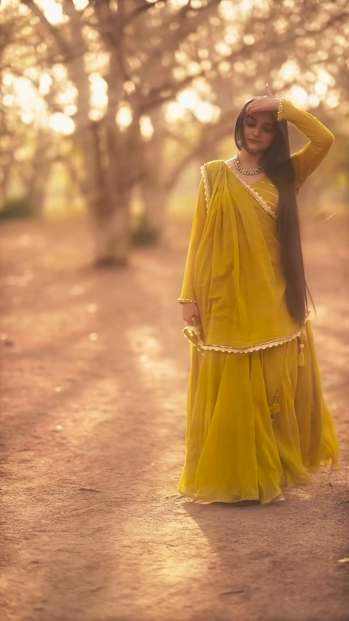 The outfit features a beautifully flared sharara bottom, paired with a solid, long-sleeved kurti adorned with subtle mirror or bead detailing along the hem and neckline. The accompanying dupatta is lightweight and sheer, embellished with delicate lace borders and playful fabric tassels that add a whimsical flair. Its golden yellow hue reflects warmth and positivity, making it ideal for daytime events and celebratory occasions.