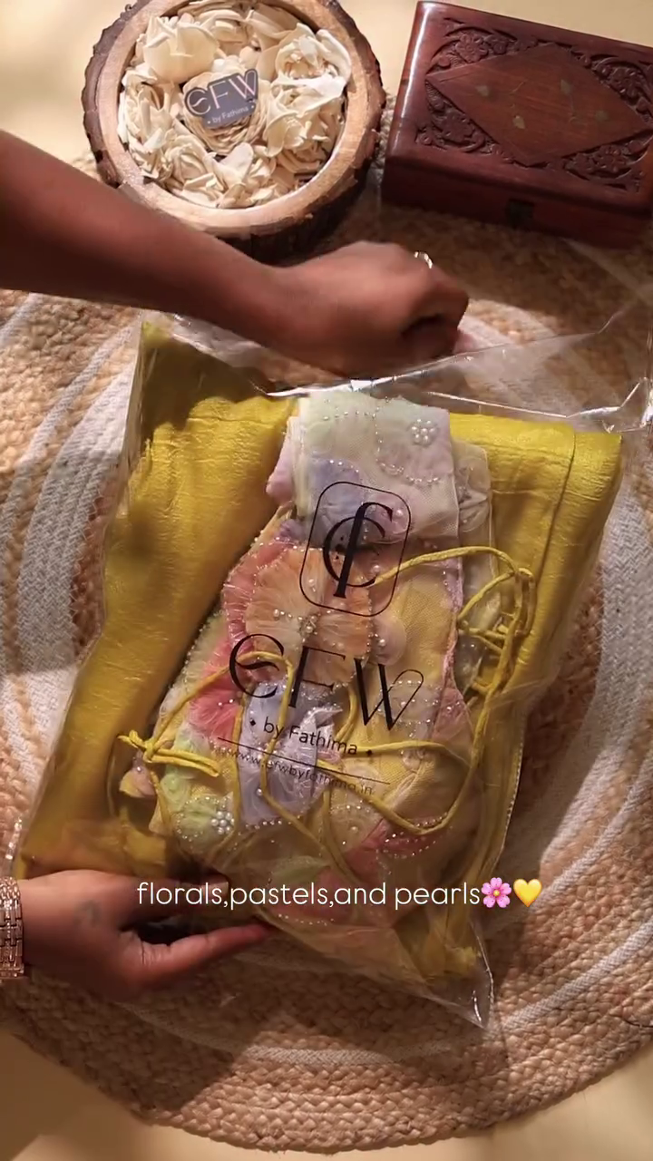The highlight of this dupatta is the beautifully crafted 3D floral motifs created with pastel pink, mint green, and blush peach organza petals. Each flower is further enhanced with intricate pearl beadwork, adding depth, dimension, and a luxurious finish. The floral arrangement is thoughtfully placed, creating a soft gradient of colors that gracefully complements the rich yellow base. The pearls not only elevate the design but also give the dupatta a sophisticated, handcrafted feel that stands out effortlessly.