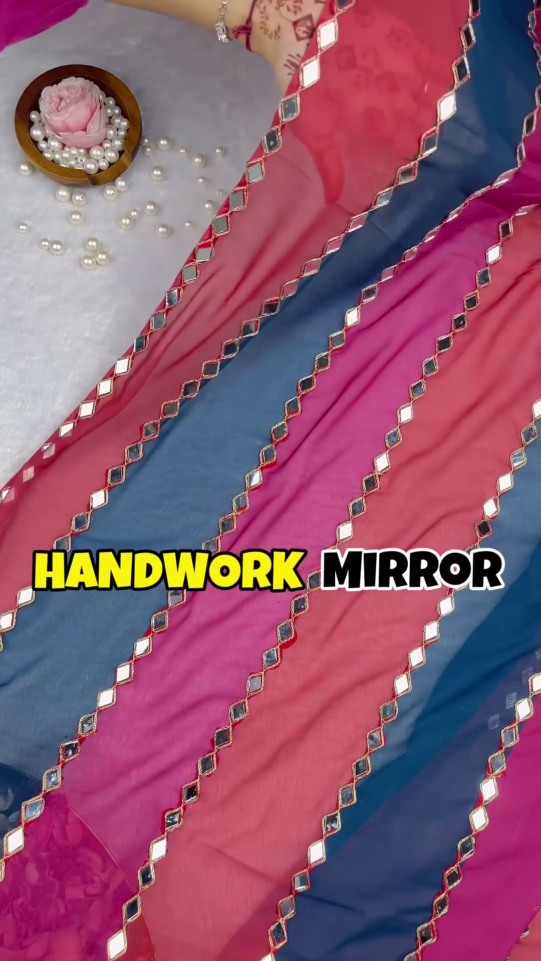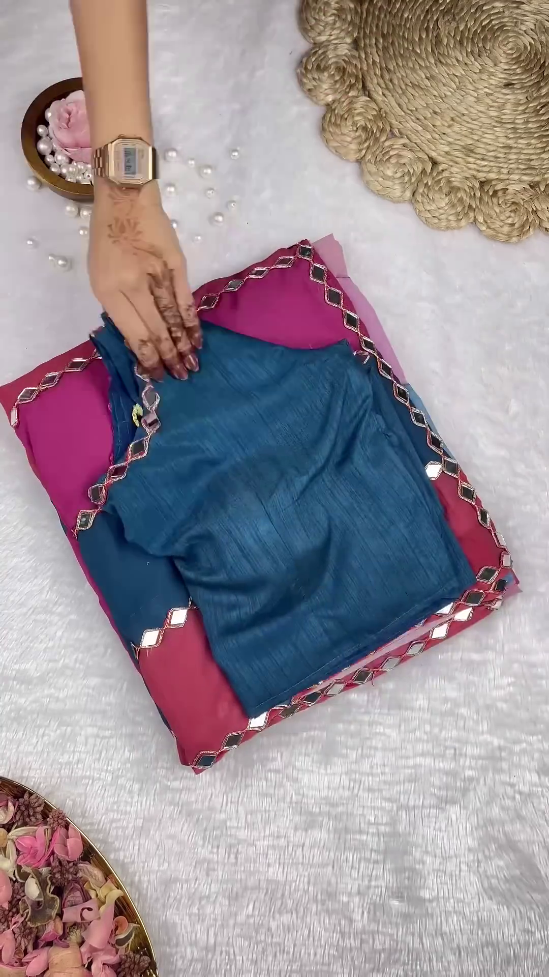 • Pair with a pink and blue ombre georgette saree to complement the vibrant teal hue and mirror-work.
