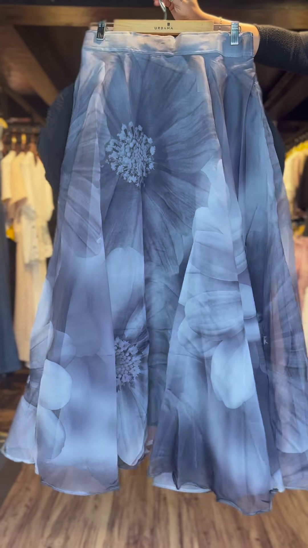 The hanger display against a blurred boutique backdrop reinforces the ensemble’s retail relevance, inviting shoppers to visualize its styling potential. Ideal for fashion creatives, stylists, or online sellers focused on layered chic, this outfit strikes a balance between bold and airy, structured and soft.