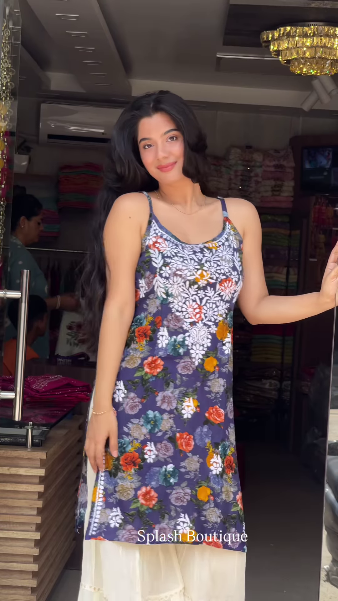 The boutique backdrop—colorful garments, signage, and subtle foot traffic—suggests real-world shopping relevance and strengthens the garment’s merchandising value. From ethnicwear edits to capsule festive collections, this kurti-bottom pairing suits a wide range of shoppers looking for grace, simplicity, and standout color dynamics.
